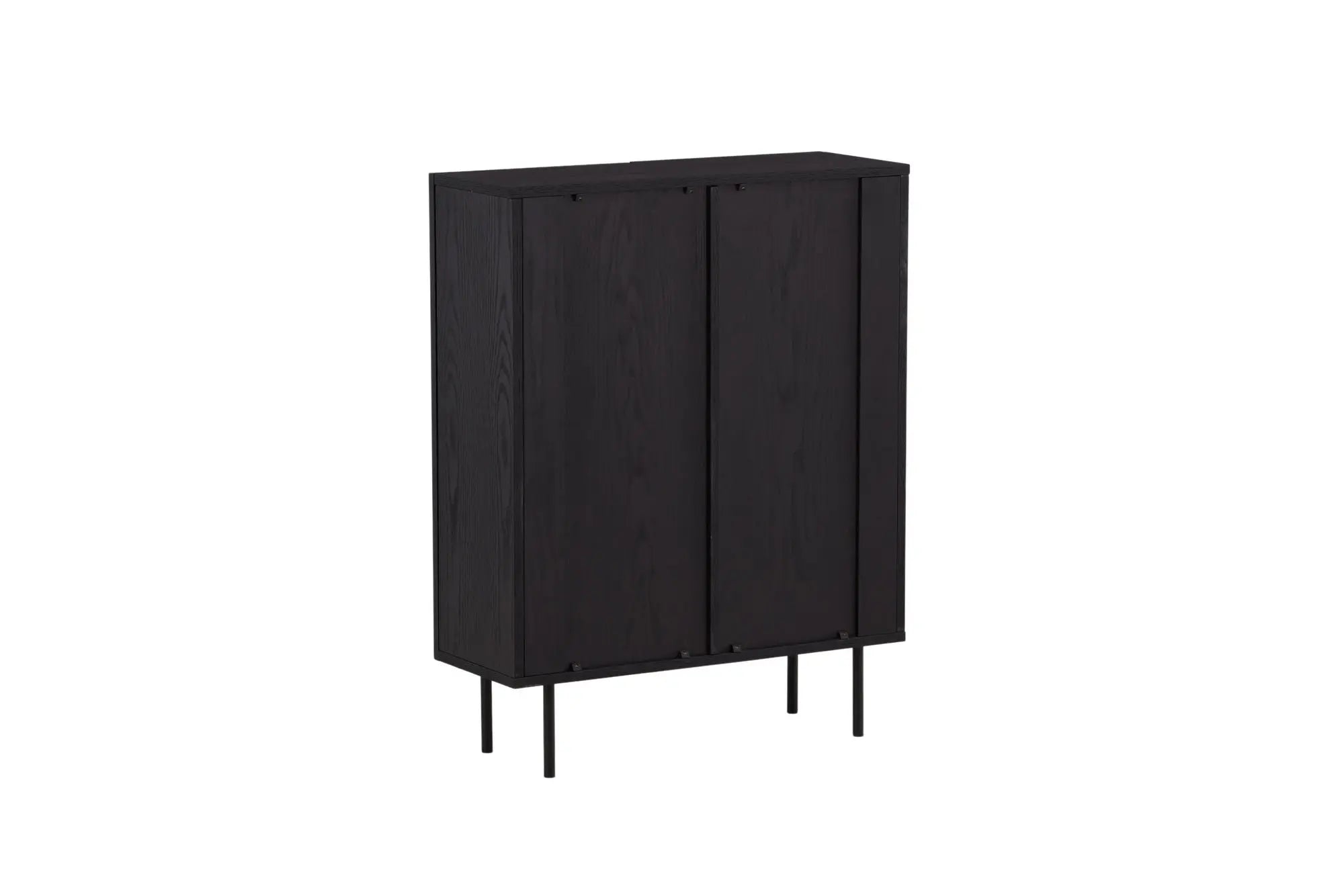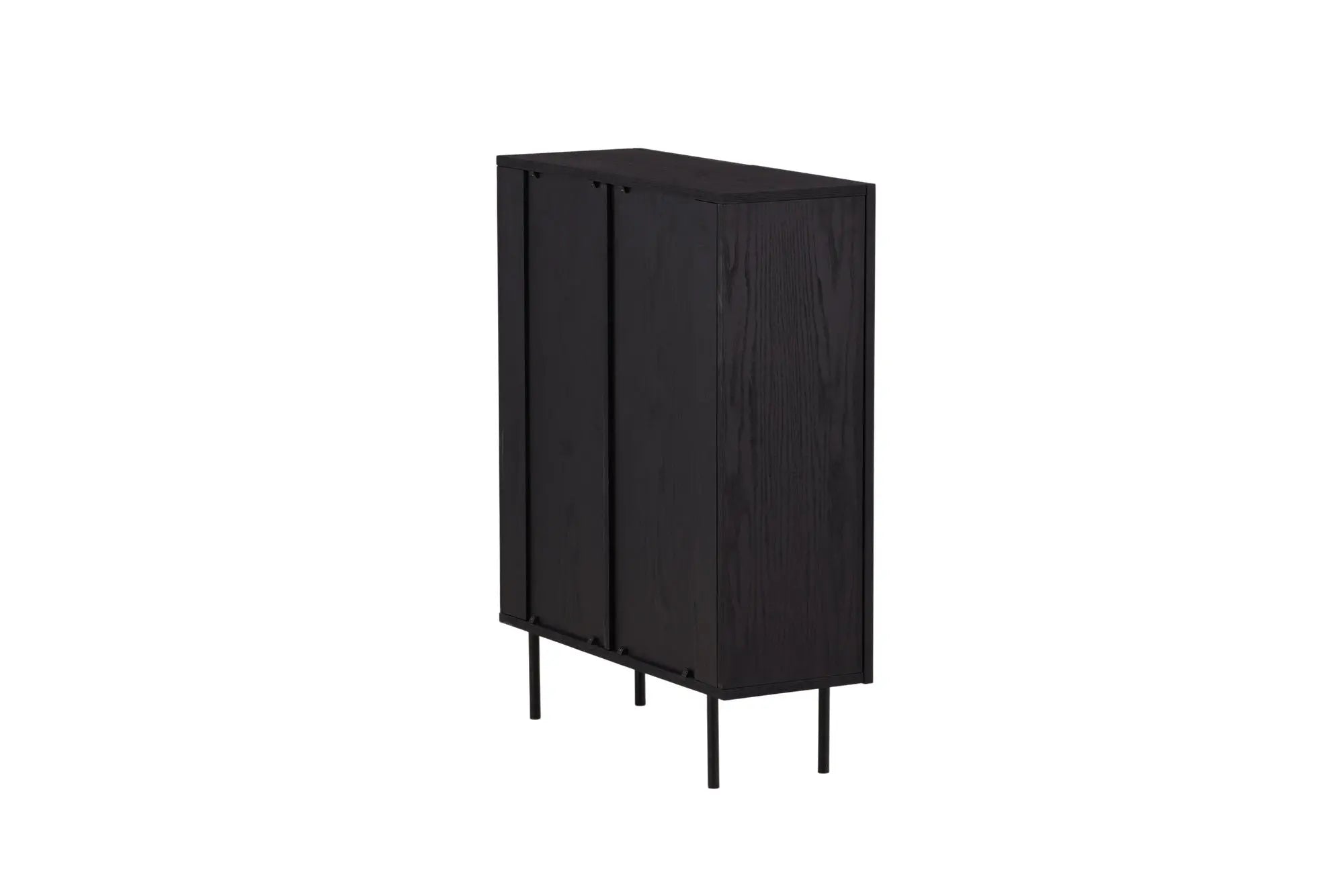 Ce meuble polyvalent, disponible en diverses couleurs, s'adapte à toutes les décorations. Son allure haut de gamme, grâce au placage noir et aux pieds en acier fin, ajoute une touche d'élégance à votre espace. Les deux portes nervurées cachent trois étagères pratiques, offrant un espace de rangement ample et discret.