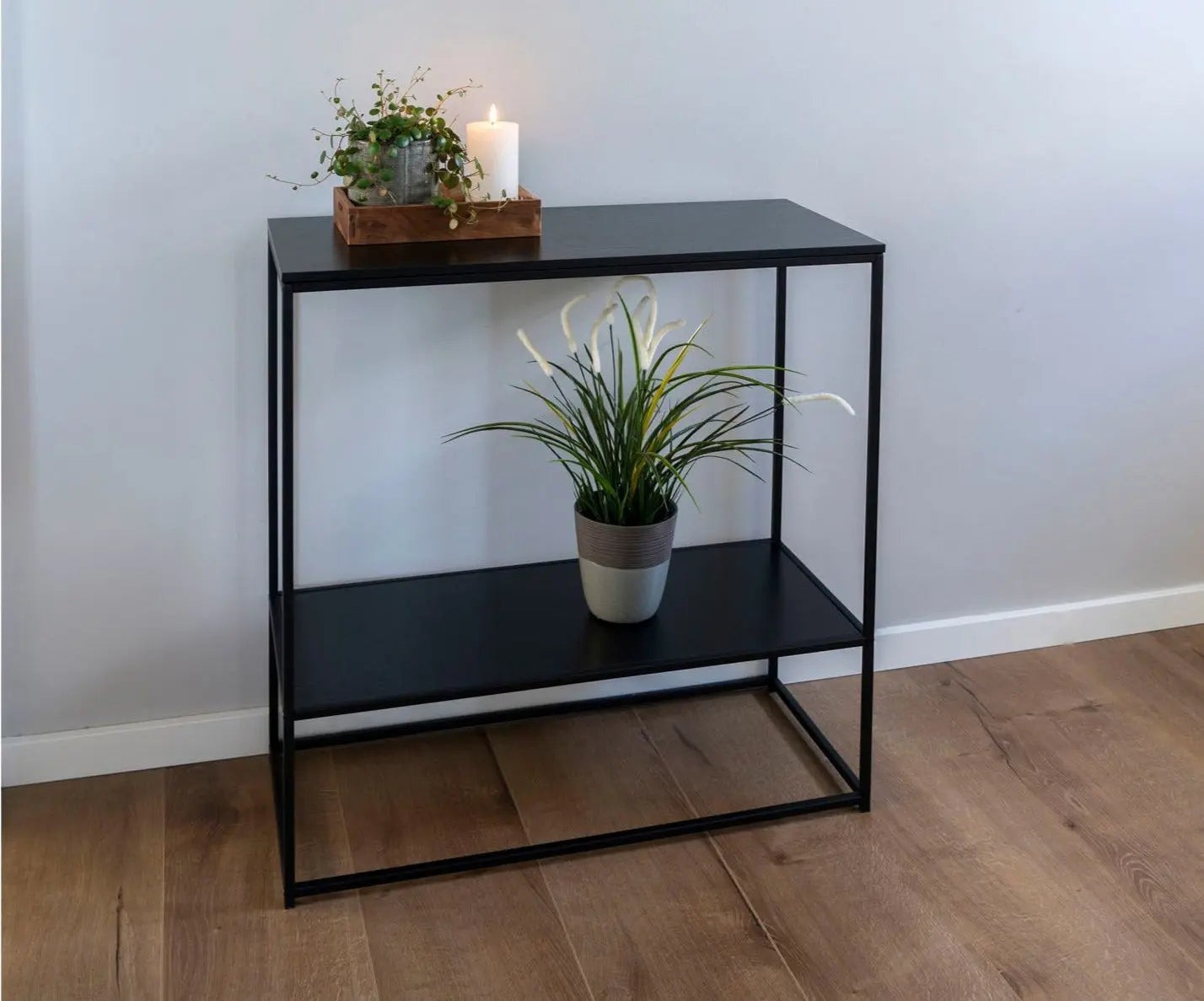 Ce meuble pratique offre deux étagères spacieuses sous un plateau robuste, idéales pour ranger vos clés, courriers ou décorations. Le noir profond de son cadre ajoute une touche de raffinement et de caractère à votre espace.
