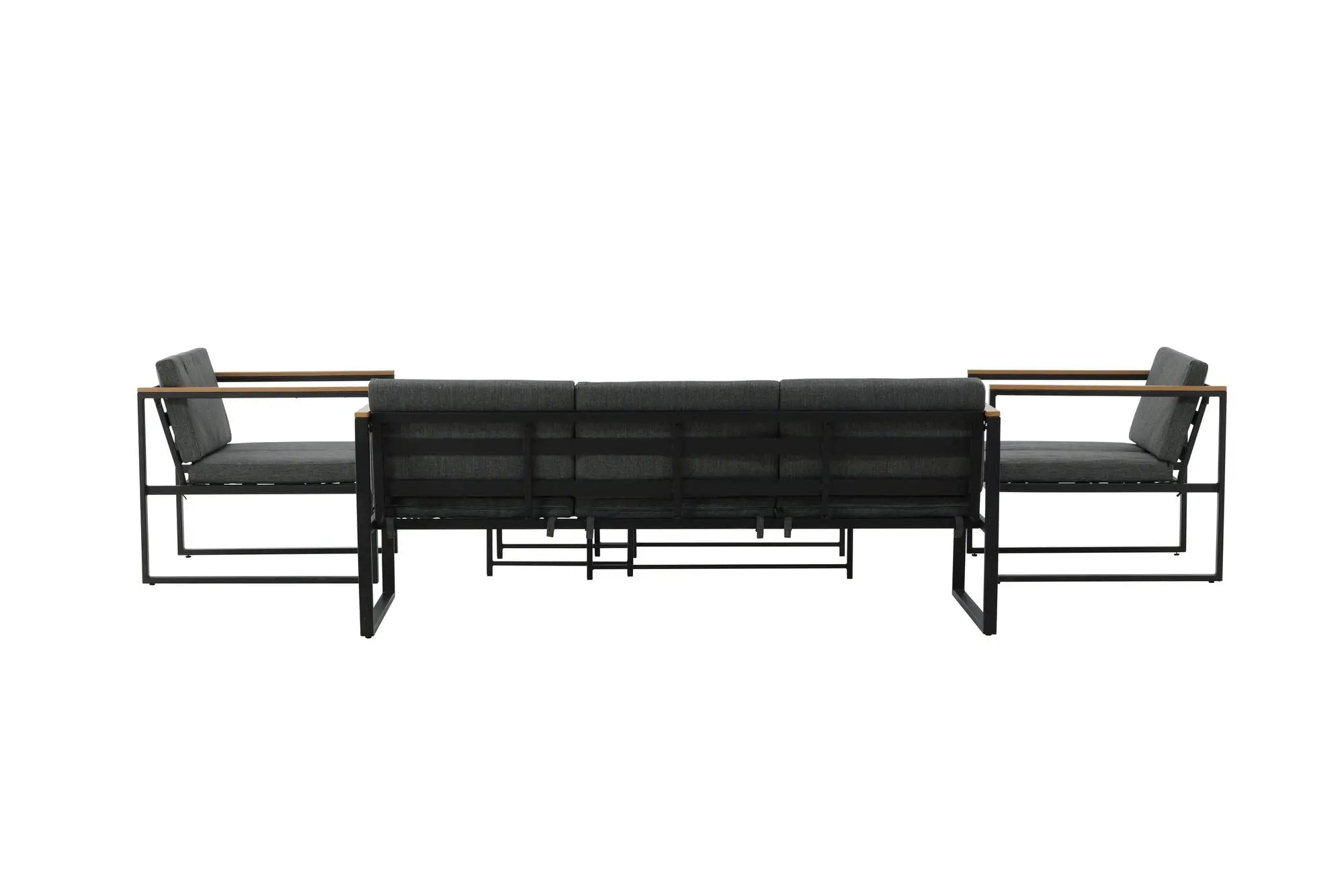 Cet ensemble, combinant acier noir et verre, offre une touche moderne à tout intérieur. Les plateaux en verre spray ajoutent une dimension élégante, tandis que les coussins en gris promettent un confort durable. C'est l'endroit idéal pour accueillir jusqu'à cinq personnes dans un confort absolu.