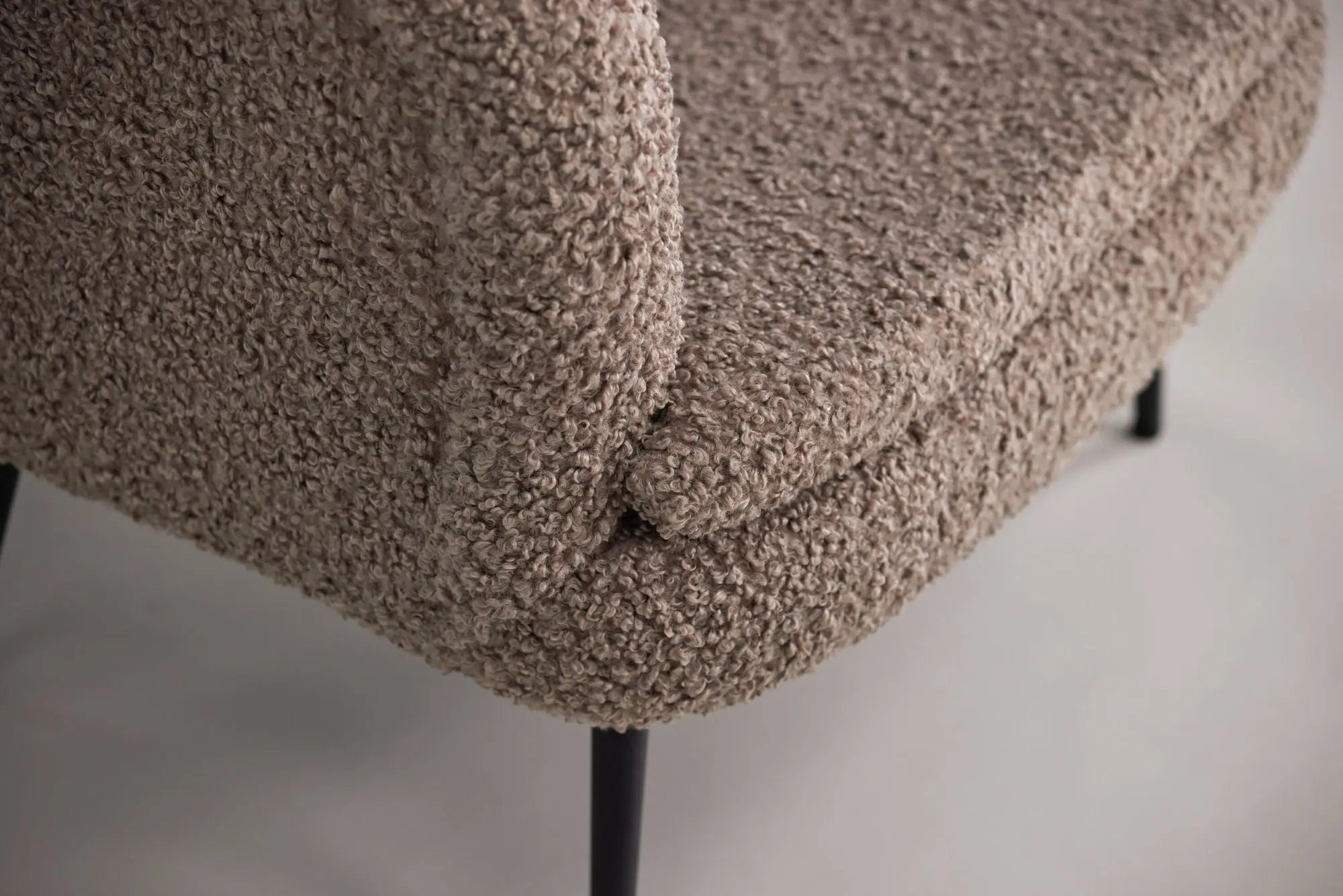 Conçu pour s'harmoniser avec les tendances actuelles, il présente un revêtement en tissu peluche beige foncé. Son allure est rehaussée par des pieds fins et élancés en acier noir, ajoutant une note d'élégance.