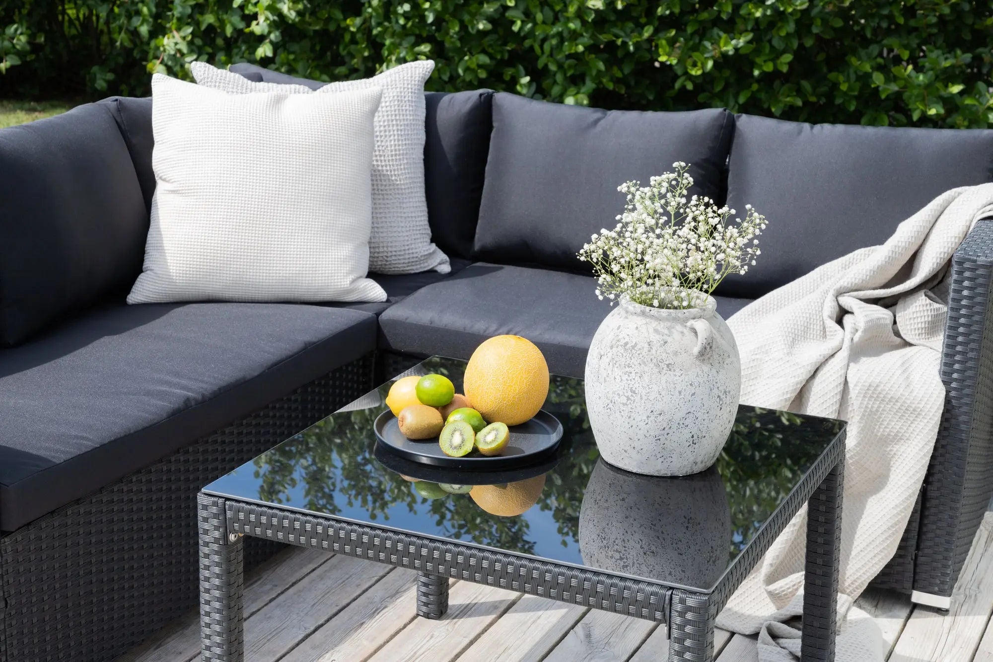 Cet ensemble modulable se compose d'un canapé d'angle flexible. Vous pouvez l'agencer selon vos envies, offrant ainsi quatre places assises et un espace convivial. Il est accompagné de coussins douillets et d'une table basse élégante, dotée d'un plateau en verre noir.