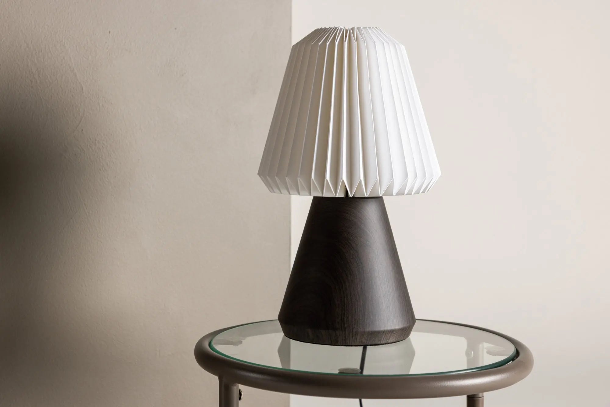 Découvrez l'élégance et la modernité avec la Lampe de table Fjällen. Ce luminaire raffiné en noyer transformera n'importe quel espace.