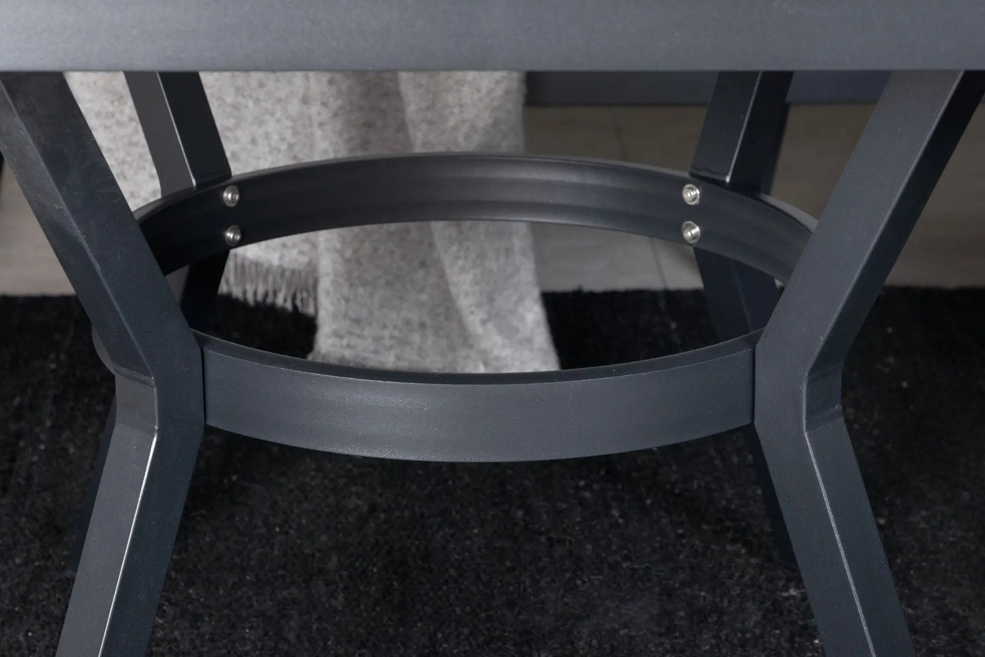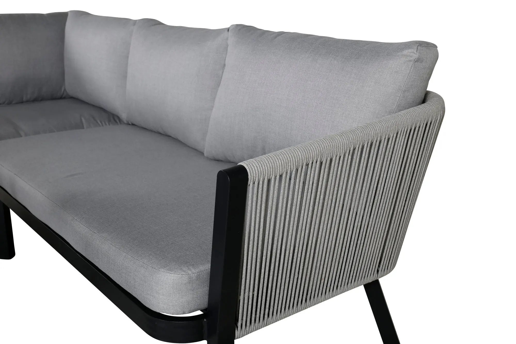 Cet ensemble se démarque par sa structure en métal thermolaqué noir, durable et raffiné, complétée par un dossier en corde gris clair. La table basse rectangulaire assortie, avec son plateau en finition grise, complète parfaitement l'ensemble, créant une harmonie visuelle apaisante.