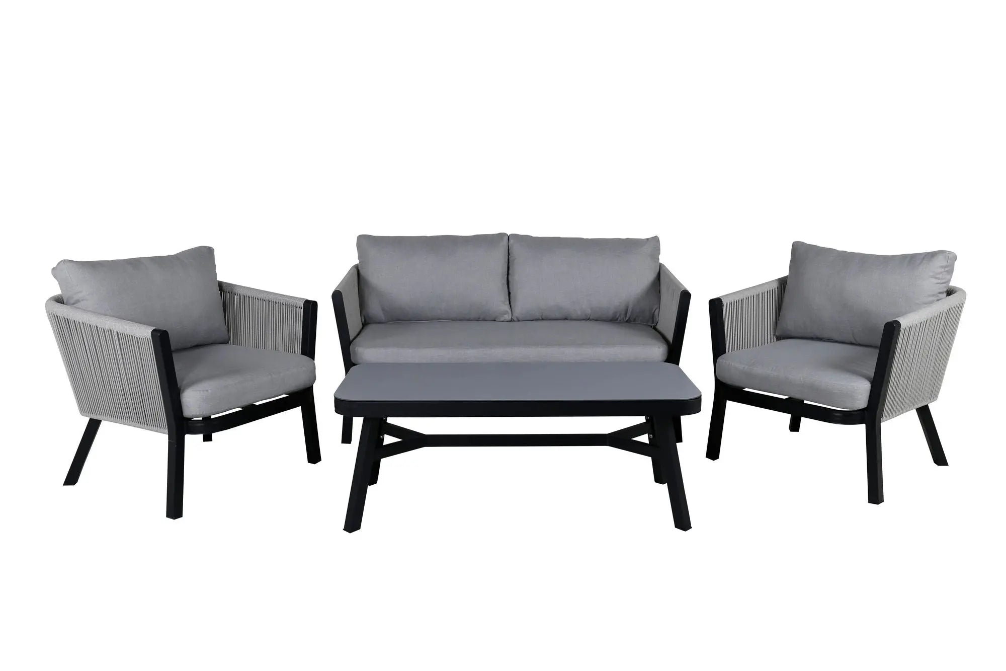 Composé d'un canapé deux places et de deux fauteuils, cet ensemble marie confort et design. Les fauteuils, avec leur structure en métal noir et dossier en corde gris clair, offrent une assise accueillante. La table basse rectangulaire complète parfaitement le décor.