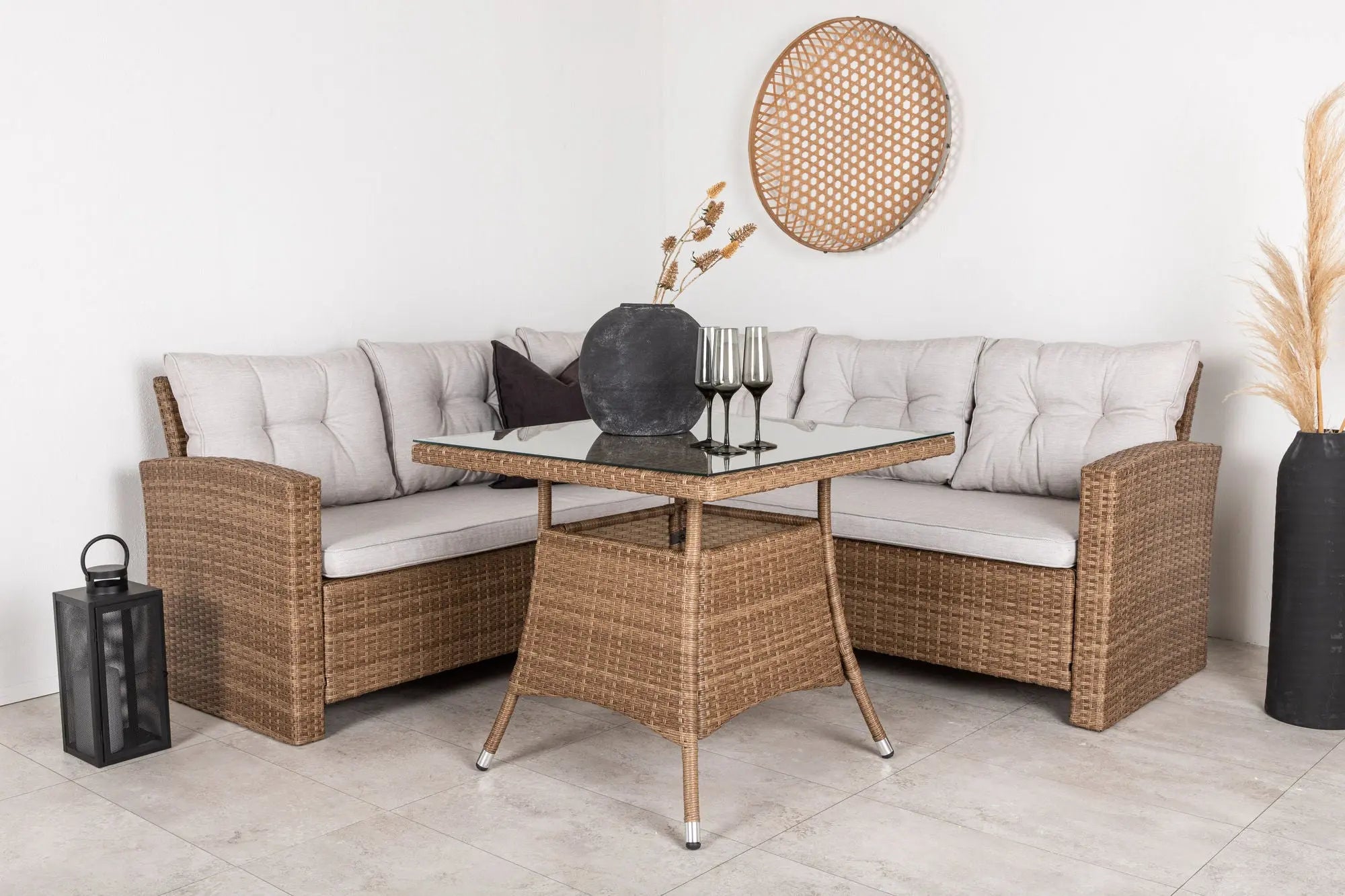 Composé d'un canapé d'angle et d'une table assortie en rotin artificiel, cet ensemble offre un design naturel et un confort optimal. Le rotin de qualité garantit durabilité et résistance aux intempéries, idéal pour tout type de climat.